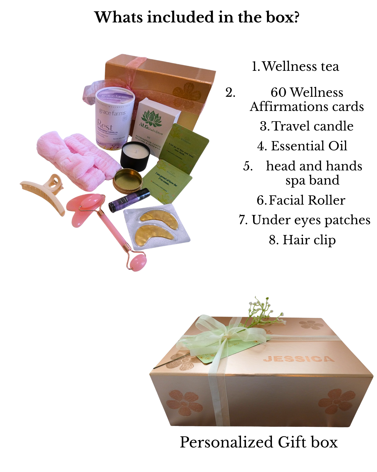 Each kit includes a curated wellness tea ritual, custom affirmation card, luxury travel-size candle, facial roller, essential oil roller, headband and wristbands, and under-eye patches. Every element is selected to encourage grounding, presence, and a sense of quiet luxury during wellness-focused experiences.